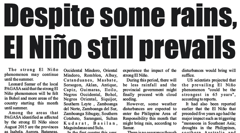 Leonard Samar of the local PAGASA said that the strong El Niño phenomenon will be felt in Bohol and more areas of the country starting this month until summer.