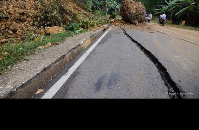 ROLLING STONE. A large boulder rolls down a steep slope and blocks half of a road in Cortes which leads to the Abatan River. (Photography by Gerald Cabal)
