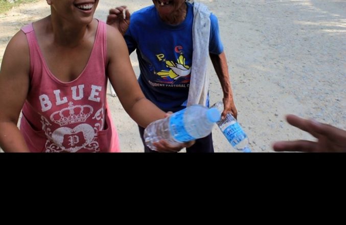 WATER PLEASE. Residents of Baang, Catigbaan who have not had supply of potable water for days ask for bottles of water from groups conducting relief operations in the village. (Photography by Christine T. Zamora)